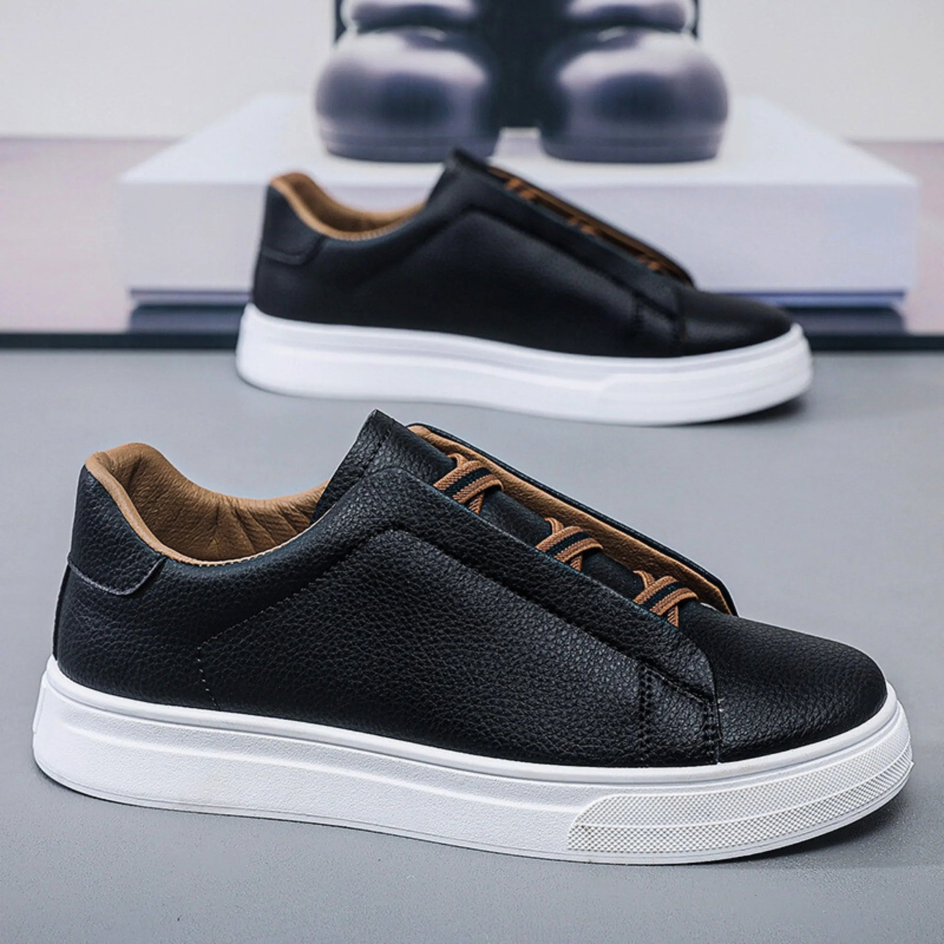 Made from premium leather, the Ezra Leather Sneakers offer a sleek and durable feel. They feature a classic slip-on style with a unique lace detail, adding a touch of uniqueness to your footwear collection.